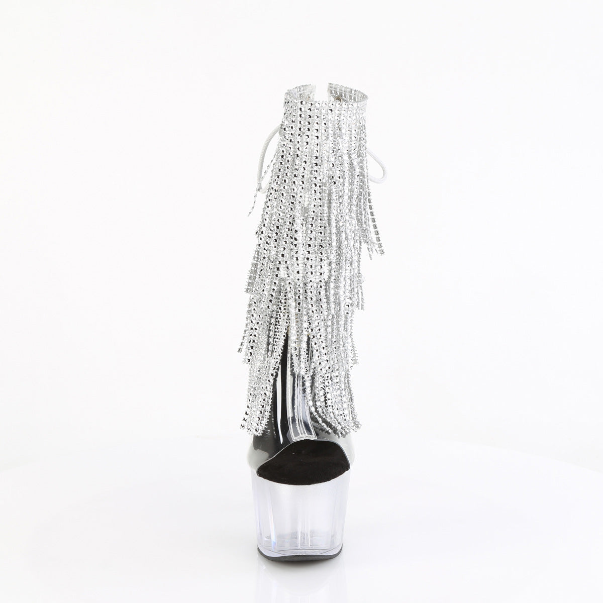 7 inch heel, 2 3/4 inch platform open toe/heel lace-up fringe ankle boot