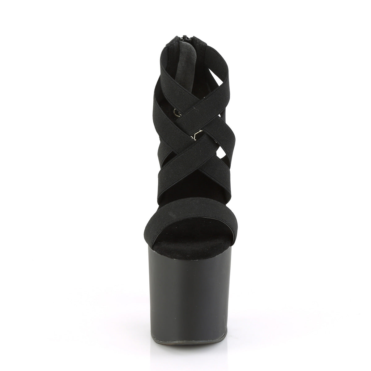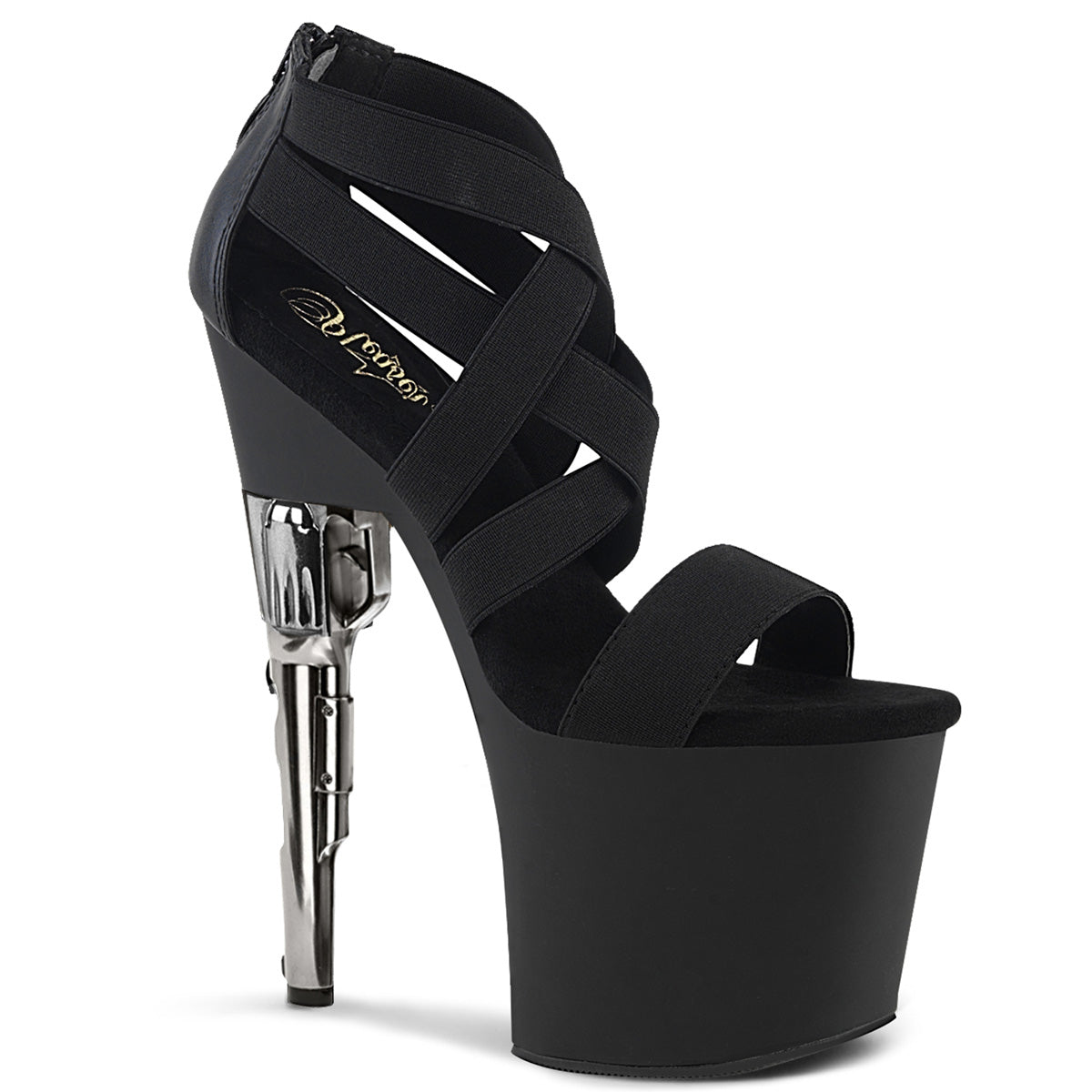 Additional Description 7 1/2"" (191mm) Gun Heel, 3 1/2"" (89mm) Platform Criss Cross Close Back Sandal w/ Elastic Straps, Back Zip Closure
