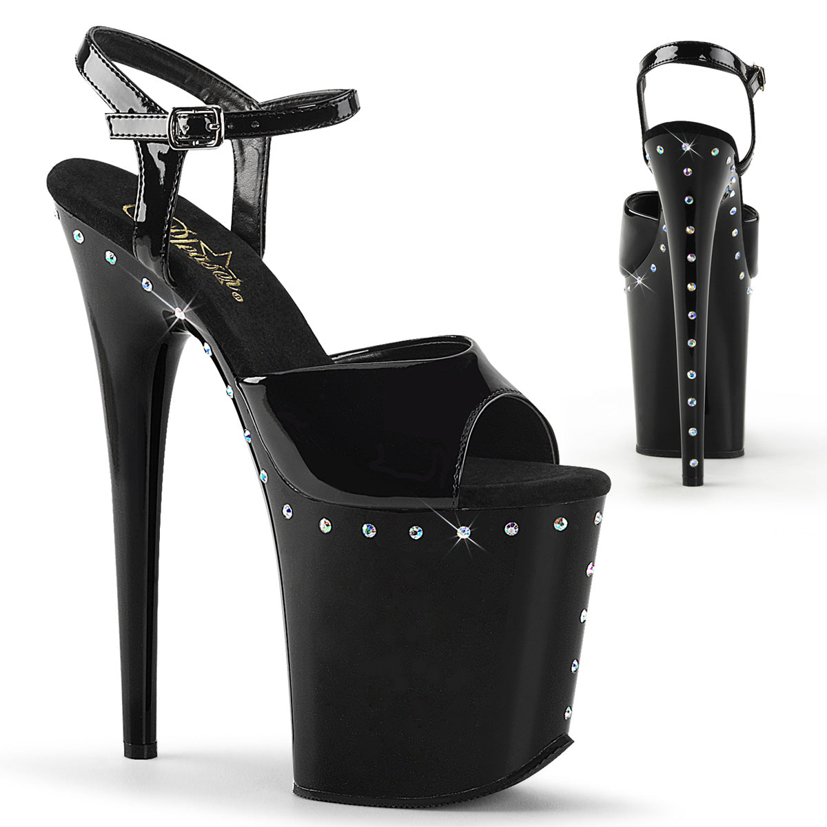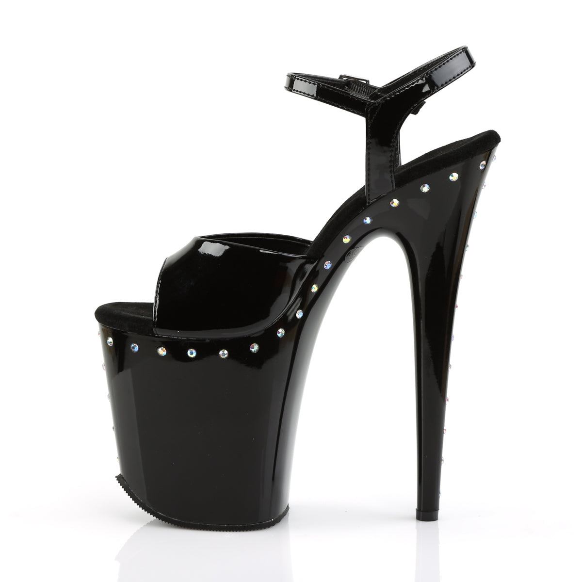 Additional Description 8"" (20.3cm) Stiletto Heel, 4"" (10.2cm) Platform Ankle Strap Sandal Featuring AB Lined Rhinestones on the Platform