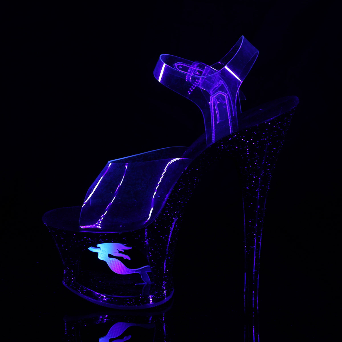 7 inch heel, 2 3/4 inch cut-outplatformankle strap sandal with mermaid