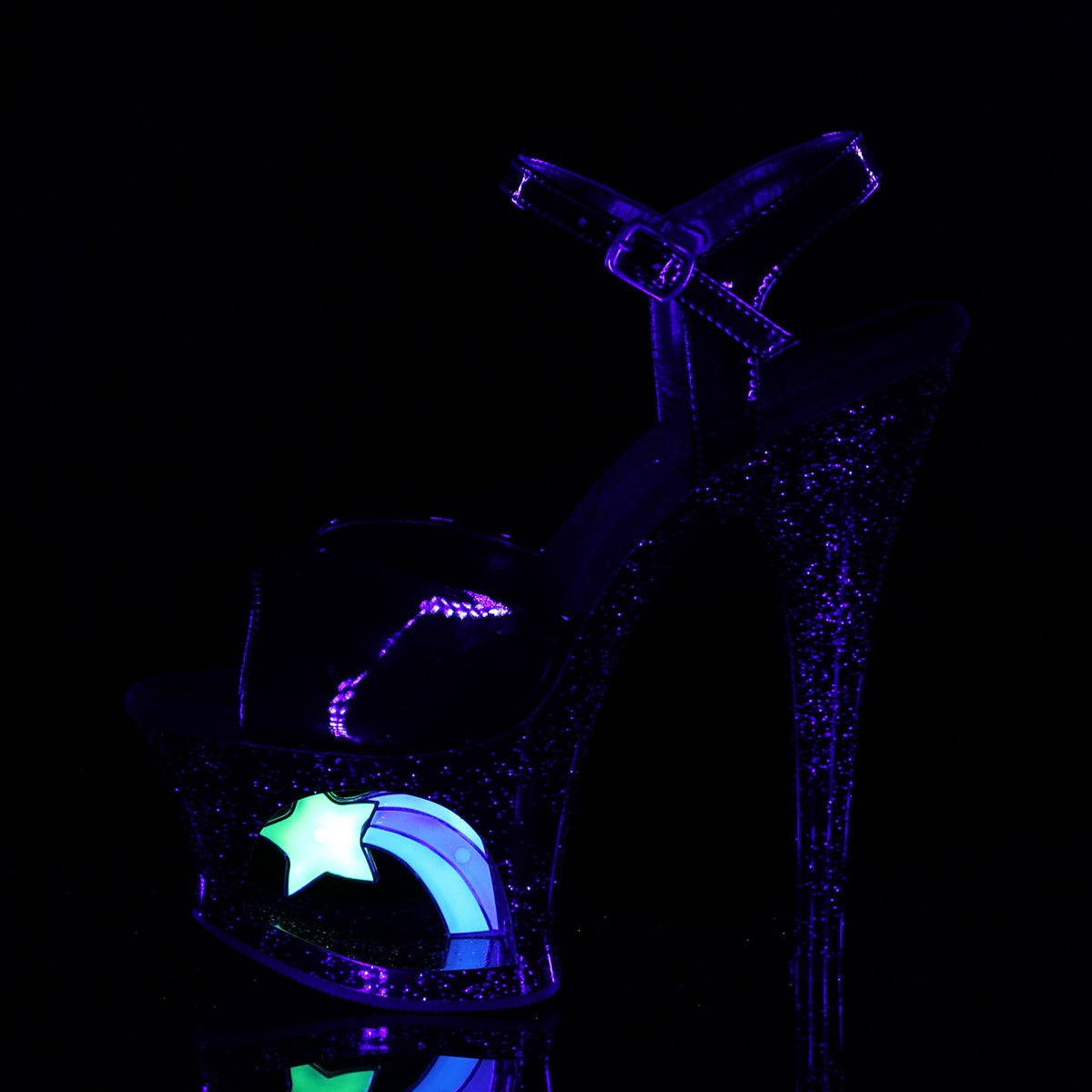 7 inchheel,2 3/4 inch cut-outplatformankle strap sandal with shooting star