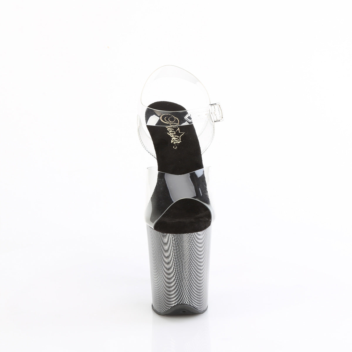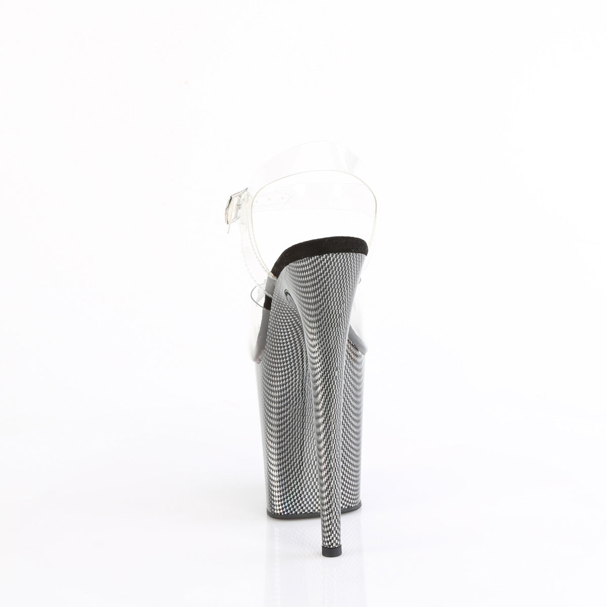 Additional Description 8"" (200mm) Heel, 4"" (100mm) Platform Ankle Strap Sandal Featuring Holographic Circular Pattern on the Platform Bottom