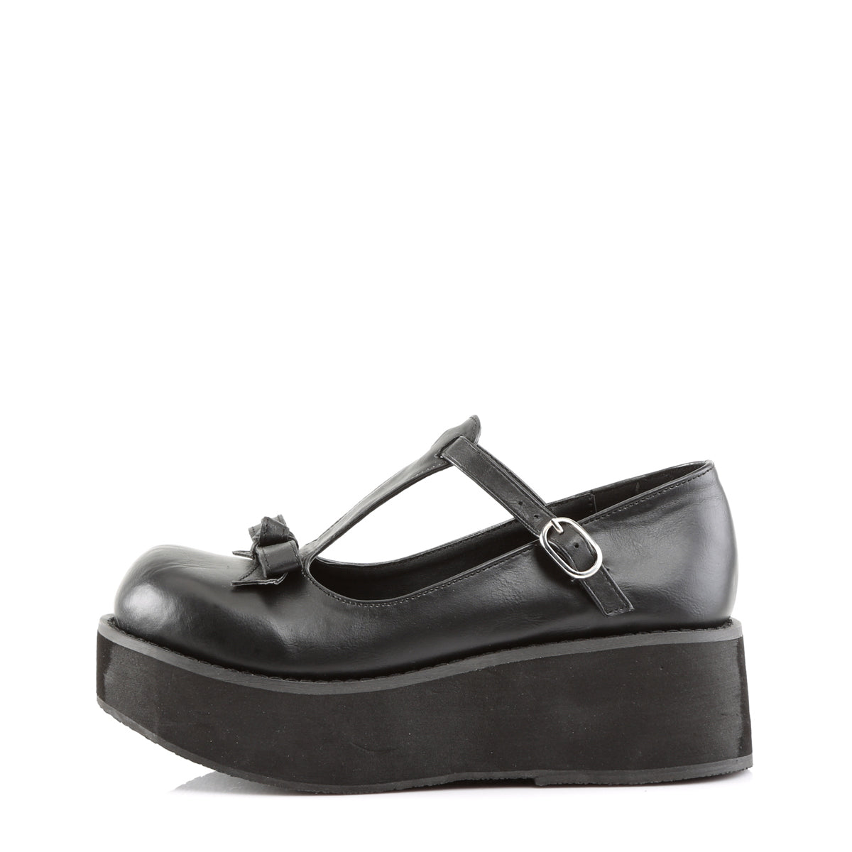 Additional Description 2 1/4"" (5.7cm) Platform T-Strap with Bow On Vamp and Buckle Detail