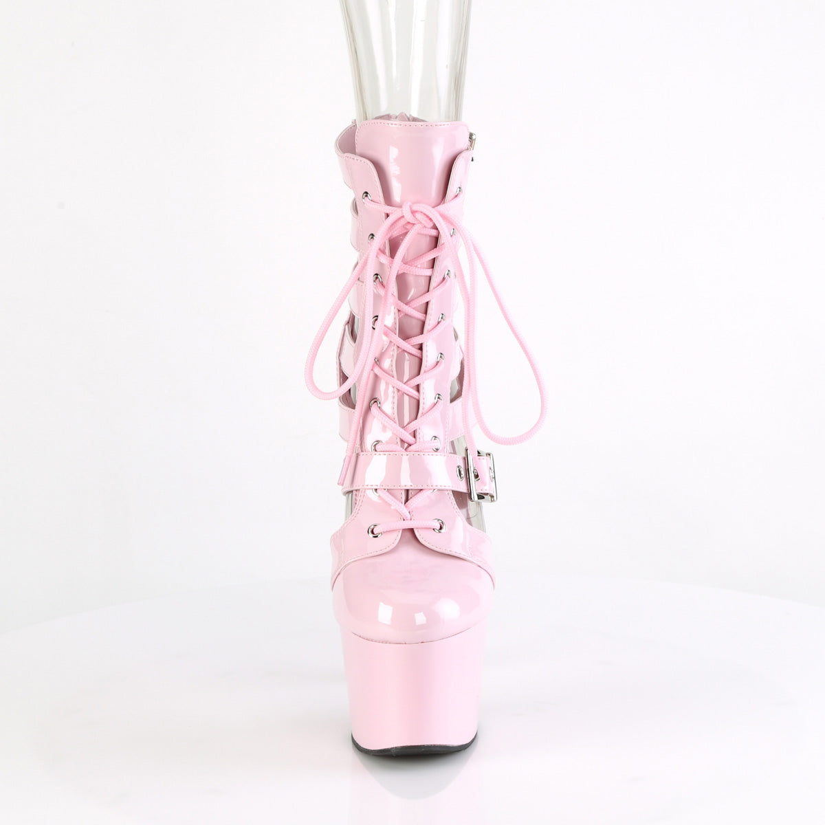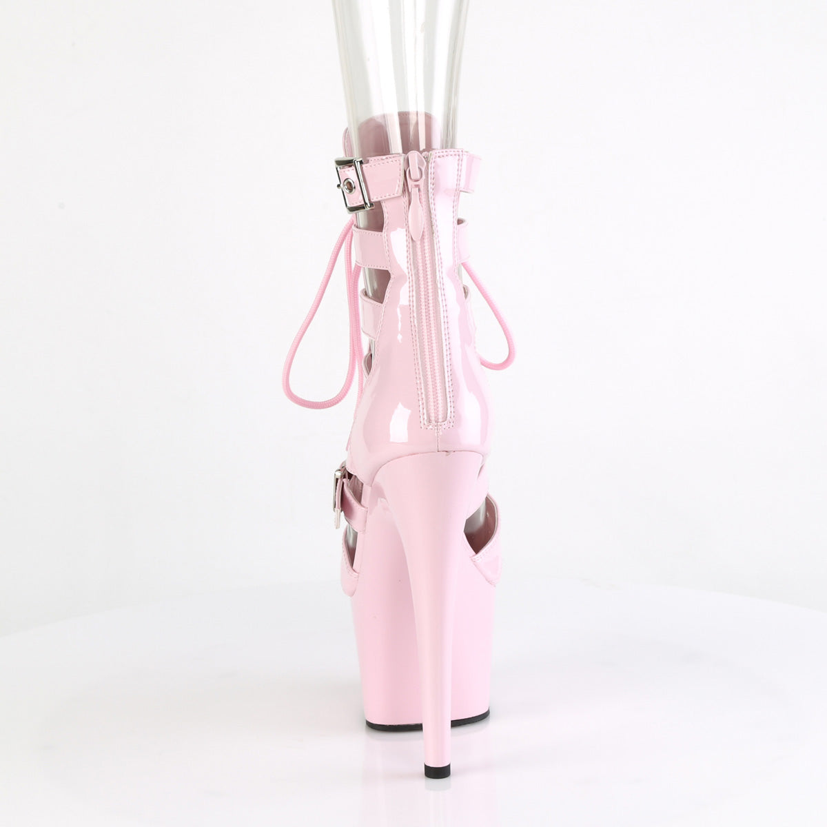 Additional Description 7"" (178mm) Heel, 2 3/4"" (70mm) Platform Strappy Dual Adjustable Buckled Strap Lace-Up Front Cage Bootie, Back Zip Closure